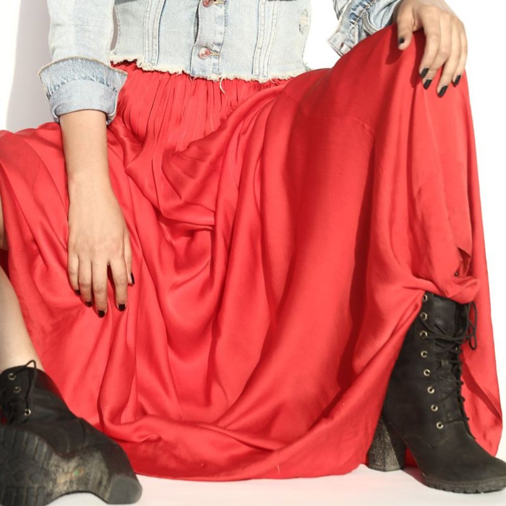 A combinação perfeita de ousadia e sofisticação. A jaqueta jeans justa valoriza a silhueta com um toque casual e moderno, enquanto a saia plissada em vermelho intenso traz movimento e elegância ao look. O contraste entre o jeans leve e o tecido fluido cria um equilíbrio visual encantador, ideal para mulheres que gostam de expressar confiança e estilo.